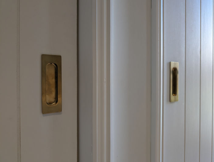 The concealed 'European' style laundry is also perfectly functional and takes up little floor space. In addition, to a very generous built-in cupboard space adjacent to the laundry, for a variety of household storage. The sliding doors concealing the 'back of house' add a welcome feature to this large space. Head height of all new elements - doors, windows, architraves, pavillion opening - is consistent, neatly tying in the competing angles within the overall design.